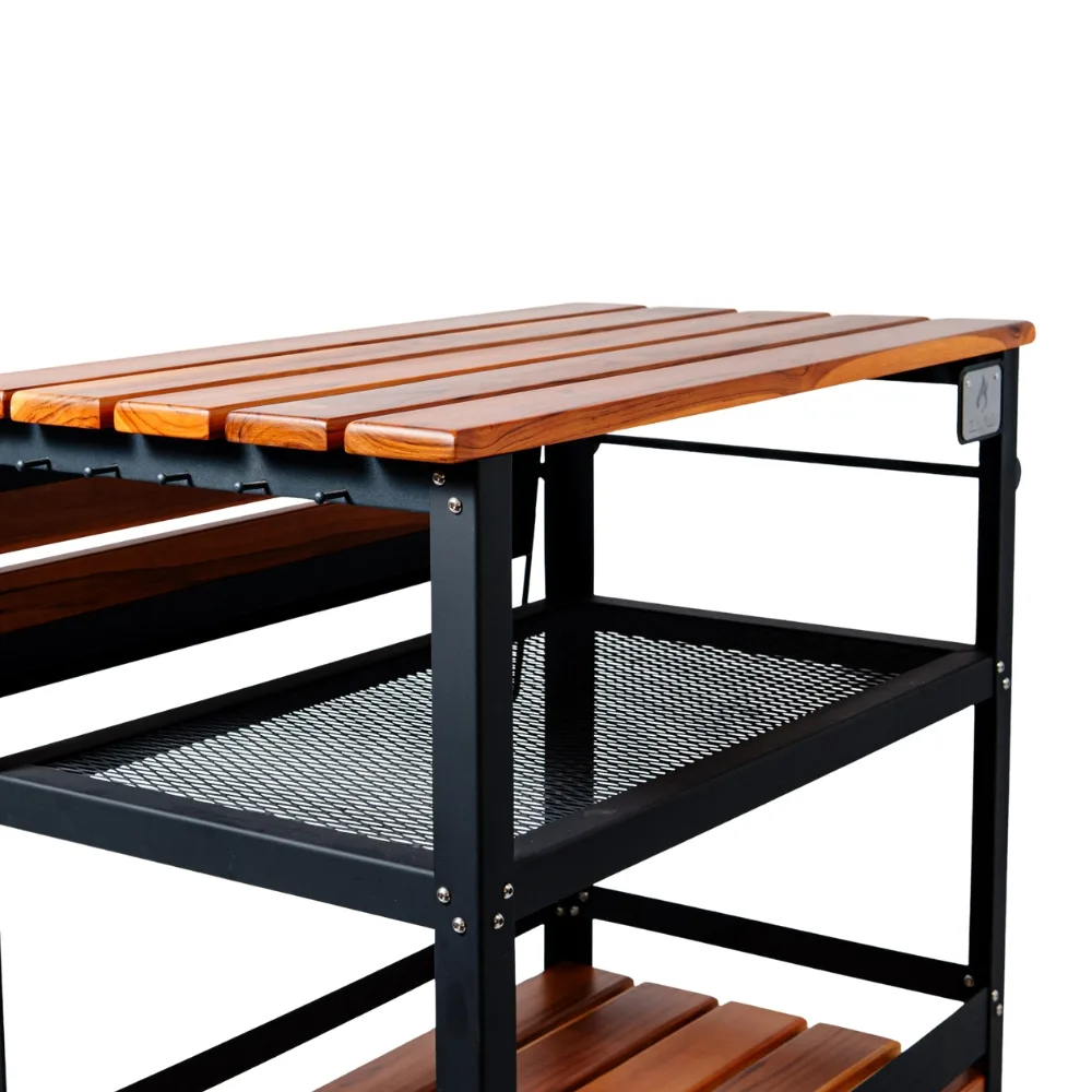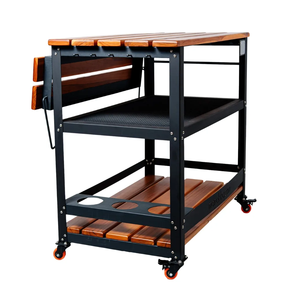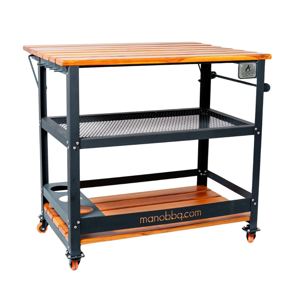 Para quien desea una estación de trabajo sólida y elegante que acompañe hornos, parrillas o ahumadores, y que mantenga todo a la mano sin perder el estilo propio de Mano BBQ.