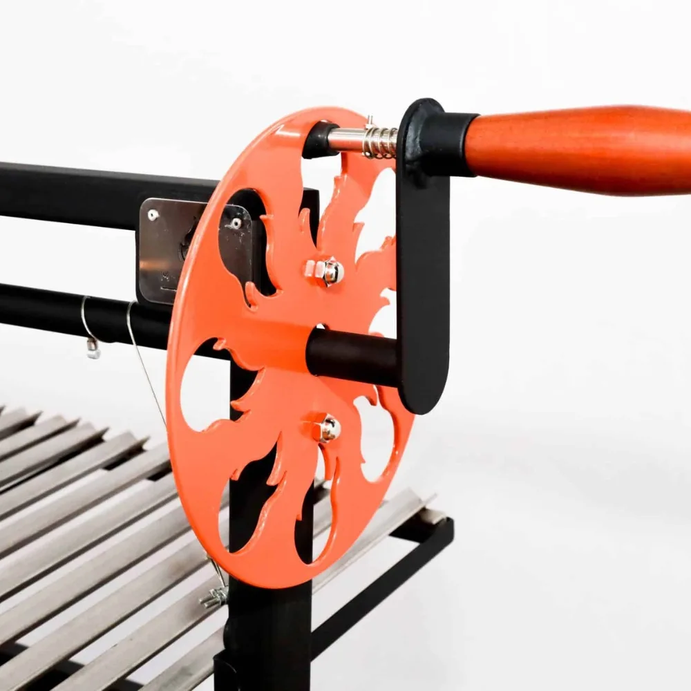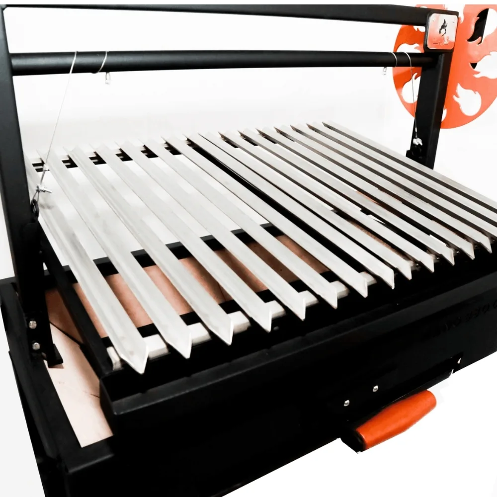 Su sistema de nivel permite subir y bajar las parrillas en acero inoxidable, fabricadas en forma de V para recoger los jugos de la carne o retirarse y dar paso a las espadas del clásico rodizio brasileño. Además, cuenta con paredes en concreto refractario que conservan el calor del carbón por más tiempo, asegurando una cocción uniforme y llena de sabor.