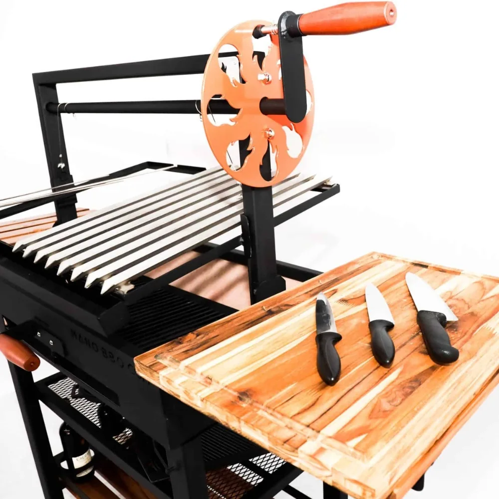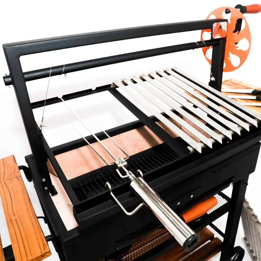 Las parrillas en acero inoxidable tienen forma de V y son desmontables, lo que no solo facilita la limpieza, sino que también permite retirarlas para dar espacio a las espadas del clásico rodizio brasileño. Así, este asador al carbón se adapta a diferentes estilos de parrillada, desde los cortes tradicionales hasta las preparaciones más especiales.