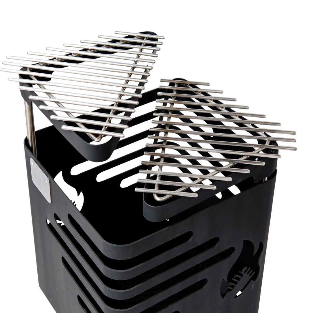 La Cesta de Fuego Nogal está construida con cuatro caras estampadas que brindan resistencia y estabilidad, además de integrar un porta ceniza y una malla porta leña extraíble para una combustión eficiente y una limpieza sencilla. Su diseño permite usarla como fogata controlada, como base para accesorios tipo parrilla o plancha, o incluso transformarla en mesa auxiliar cuando se enfría . Es una estructura pensada para quienes quieren disfrutar del fuego con seguridad y versatilidad.