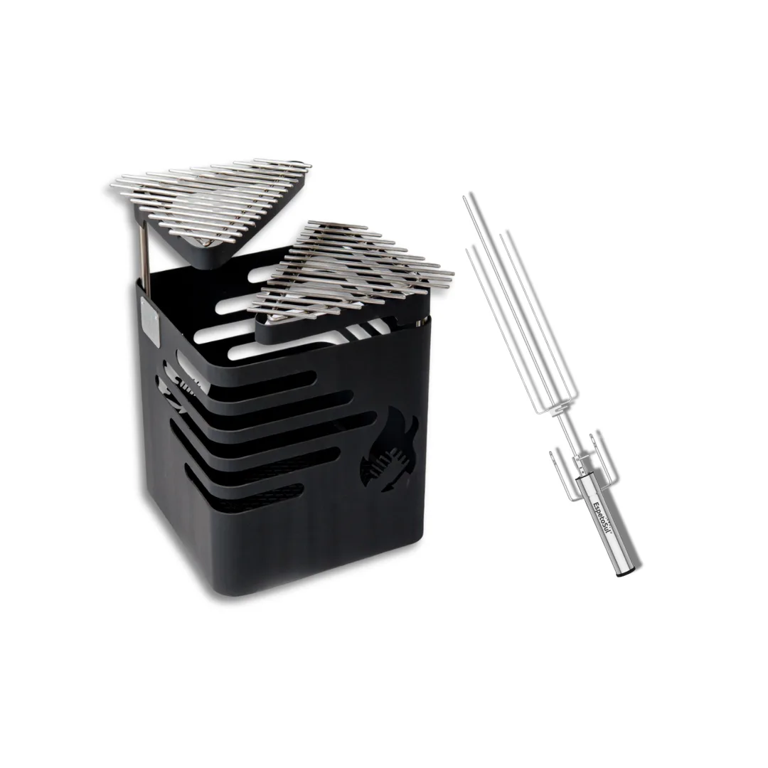 El Combo Cesta de Fuego Nogal + Espeto Giratorio Black Days reúne dos herramientas diseñadas para quienes disfrutan cocinar al fuego con estabilidad, control y un asado uniforme. Esta combinación une la solidez de una cesta compacta y segura con la precisión de un espeto motorizado, permitiendo preparar cortes con giro constante y un calor aprovechado de manera eficiente.