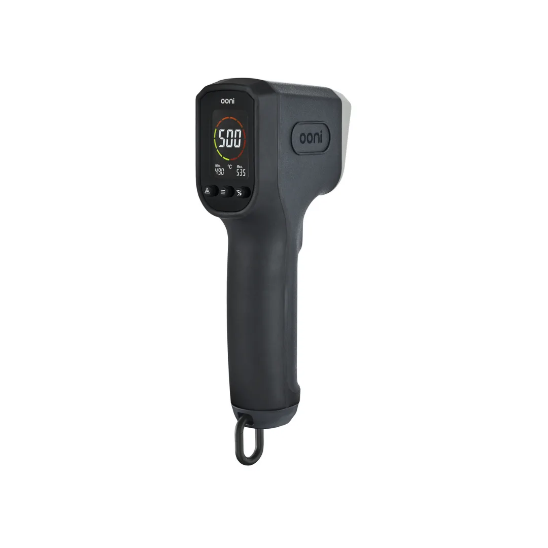 Finalmente, el combo incorpora un termómetro infrarrojo, indispensable para medir la temperatura real de la piedra o superficie de cocción. Esta información es clave para saber cuándo ingresar cada preparación y garantizar un resultado más preciso y uniforme.